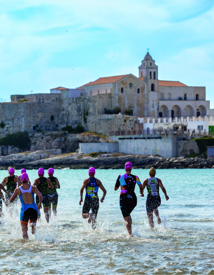 … Il nuoto si svolge nelle acque cristalline del Gargano, il percorso ciclistico si addentra in uno scenario unico tra falesie bianche e macchia mediterranea, seguito da una corsa panoramica sul lungomare e nel centro storico. Vieste vanta una storia millenaria che affonda le radici nella leggenda, con l’imponente e suggestivo Pizzomunno, simbolo della città, il suo castello svevo-aragonese che domina la rupe e un centro storico fatto di viuzze strette e case bianche a picco sul mare. Antico scalo marittimo strategico per greci e romani, la città conserva il fascino del borgo marinaro medievale con la sua maestosa Cattedrale dell’Assunta. Gareggiare a Vieste non è solo una sfida agonistica su distanza olimpica, ma un vero viaggio nel cuore pulsante della Puglia, tra miti d’amore e una natura incontaminata che toglie il fiato.